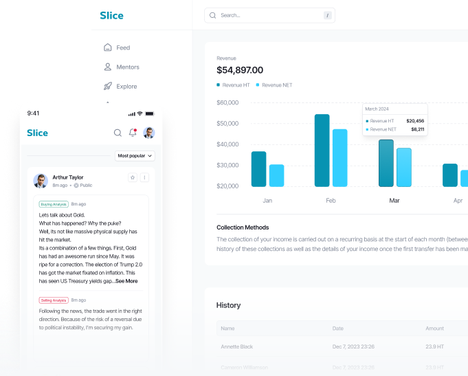 With Slice, you see exactly what your mentor is doing, when they do it. Follow their transactions, analyze their market decisions, and track their performance through detailed statistics. Our platform is built to offer full transparency.